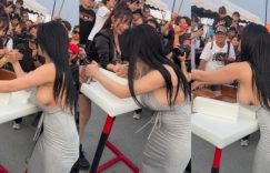 常常看到男性在進行「比腕力」這項活動,圍觀的民眾常常覺得刺激,但其實女生比腕力也很有看頭,最近網路上流傳兩個女生比腕力的影片,其中一位正妹穿著連身洋裝,側邊露出了大片巨乳,而且還得到了壓倒性的勝利,火辣比賽讓周圍民眾都熱血沸騰。 圖片來源:Instagram @ ▶ ▶